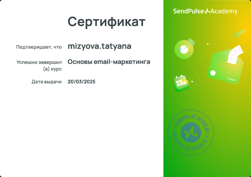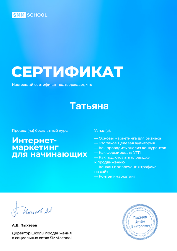 Окончила ПГНИУ по направлениям «Торговое дело» (профиль: «Маркетинг») (2023) и «Цифровой менеджмент в управлении проектами и командами» (2025). Прошла курсы «CRM: от бизнес-концепции к маркетингу» от Mindbox (2025, сертификат), «Интернет-маркетинг для начинающих» от SMM.school (2025, сертификат), «Основы email-маркетинга» (2025, сертификат) и «Доставляемость email-рассылок» от SendPulse Academy (2025, сертификат).