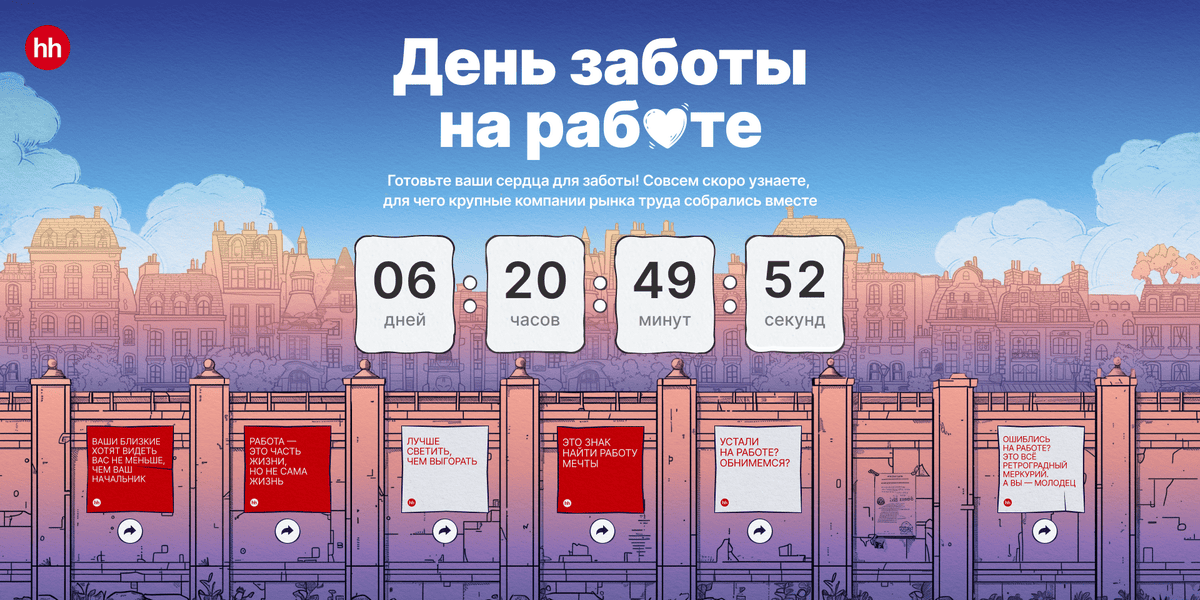 Задача лендинга — рассказать, как компании-партнёры hh.ru заботятся о своих сотрудниках: помогают развиваться, обеспечивают комфорт, борются с выгоранием. Проект, ставший традиционным «Днём заботы на работе», ежегодно привлекает внимание аудитории hh.