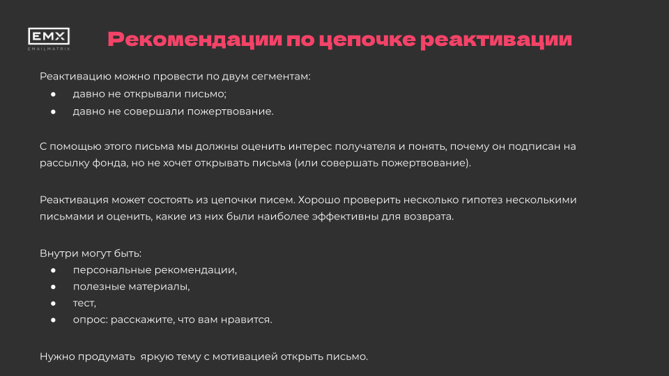 Вы получите презентацию с результатами анализа и рекомендациями, которые помогут улучшить показатели рассылок (открываемость, кликабельность, глубину просмотра, отток подписчиков) и оптимизировать CRM- и емейл-маркетинг.